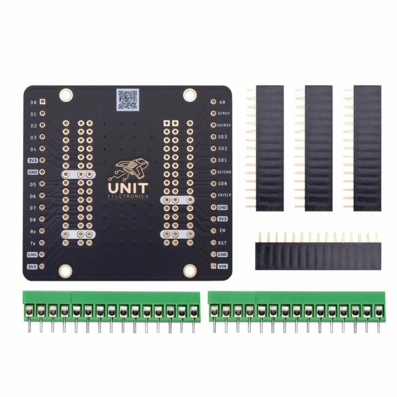 UNIT Placa de Expansión para NodeMCU ESP8266, te ayudará a tener fácil acceso a todos los pines de las placas de desarrollo NodeMCU, compatible con la versión rectangular y cuadrada. Incluye conectores clemas o boneras para interconectar de forma rápida y sencilla, módulos, sensores, actuadores y más, también incluye 2 tiras headers hembra que podrás soldar en la placa PCB de acuerdo a la versión de NodeMCU a utilizar, antes de soldar estas tiras verifica la serigrafía de la placa pcb la cual indica el tamaño y los pines para cada placa NodeMCU. También incluye otras 2 tiras header hembra que puedes soldar en la columna de pines que están cerca de los barrenos para tener fácil conexión a los pines de la NodeMCU con cables dupont macho.