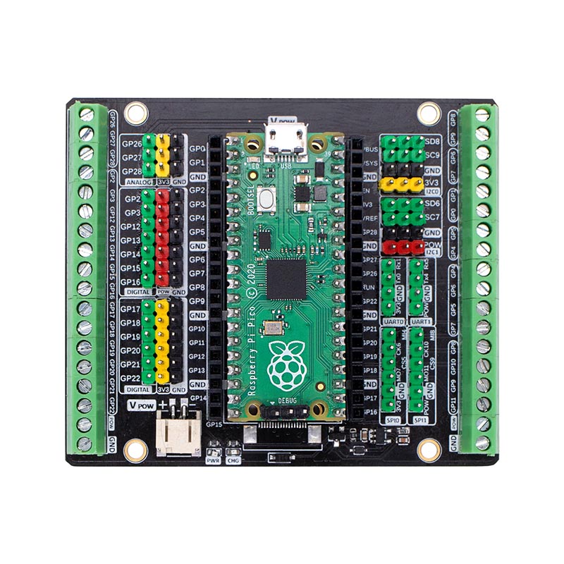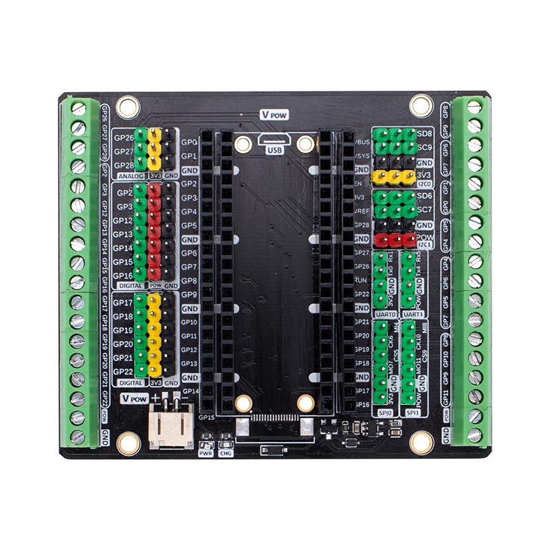 Ideal para facilitar la creación de proyectos y prototipos basados en Raspberry Pi Pico. La placa ofrece varios puertos de comunicación, incluidos 2 I2C, 2 UART, 2 SPI, 3 E / S analógicas, 13 E / S digitales, conector de alimentación de 3.3 ~ 5.5V y puerto GDI.