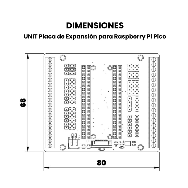 La UNIT placa de expansión para Raspberry Pi Pico, es una placa de expansión para Raspberry Pi Pico que permite expandir y simplificar las conexiones a todos sus pines. Incluye: