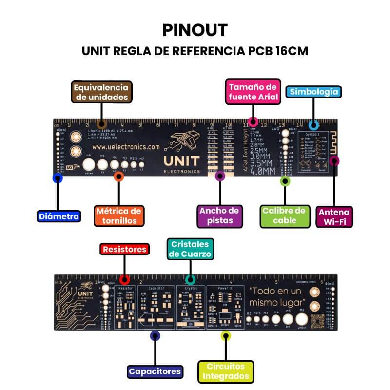 La regla UNIT es ideal para que cualquier persona pueda tener referencias para realizar PCB y realizar mediciones de longitud, tornillos, calibre de cable, barrenos y mucho más a donde quiera que vaya.