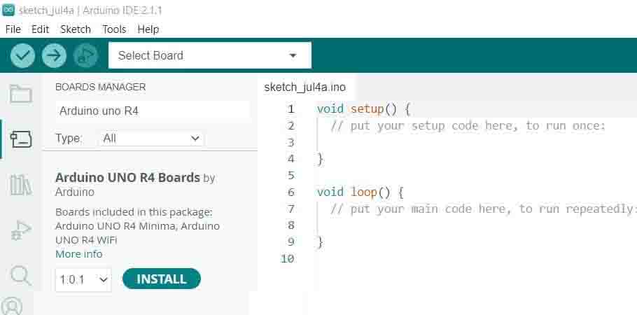 5. Instalación en el IDE: Da clic sobre el segundo icono de la barra que se encuentra del lado izquierdo para acceder al Gestor de tarjetas, dentro de la barra de búsqueda escribe Arduino Uno y da clic en instalar