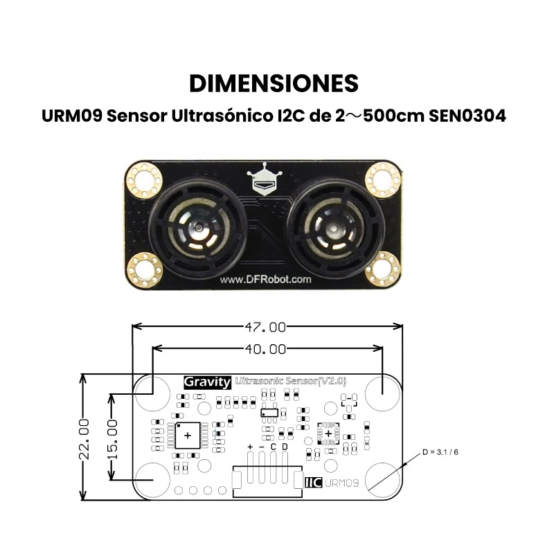 El URM09 Sensor Ultrasónico I2C SEN0304 de DFRobot es un sensor compacto diseñado para medir distancias de forma rápida y precisa entre 2 cm a 500 cm, además sirve para detectar objetos, lo que lo hace ideal para proyectos de robótica, vehículos autónomos y sistemas de detección de obstáculos. Su comunicación mediante I²C facilita la conexión con microcontroladores como Arduino o Raspberry Pi.