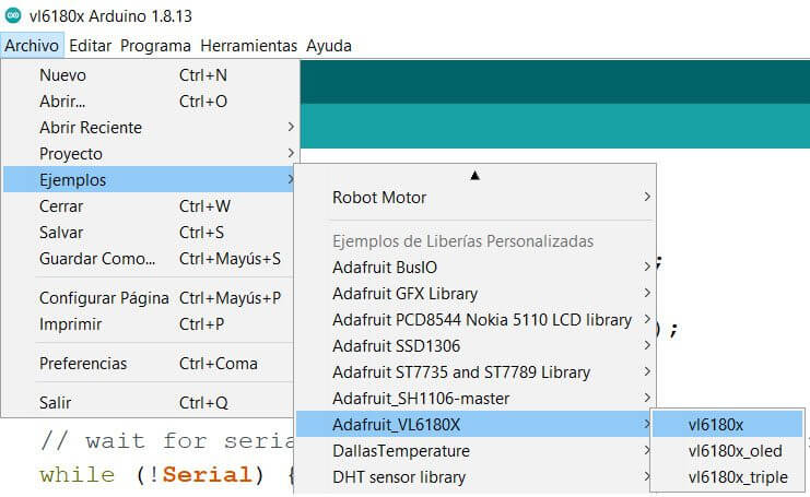 Posteriormente, cargaremos el código de ejemplo: vl6180x para usar un solo sensor de proximidad: