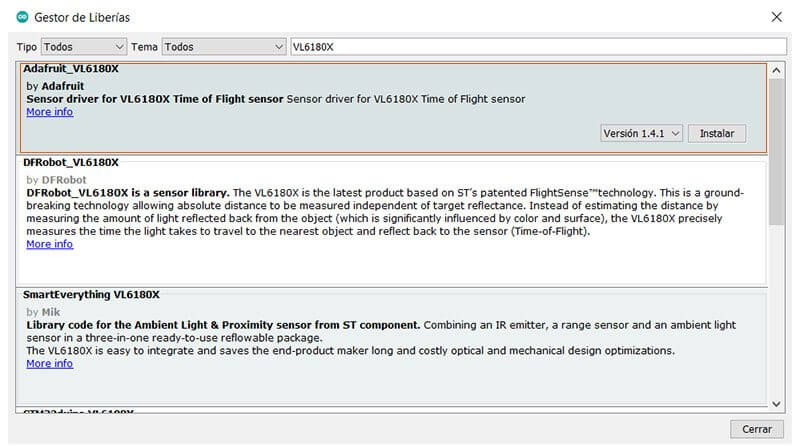 Para usar nuestro VL6180X en el IDE de Arduino, requeriremos la librería destinada a este sensor, la cual tiene el nombre de Adafruit VL6180X: