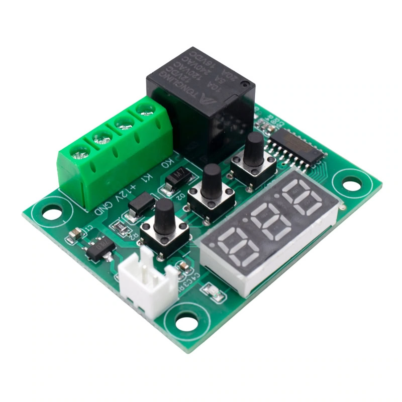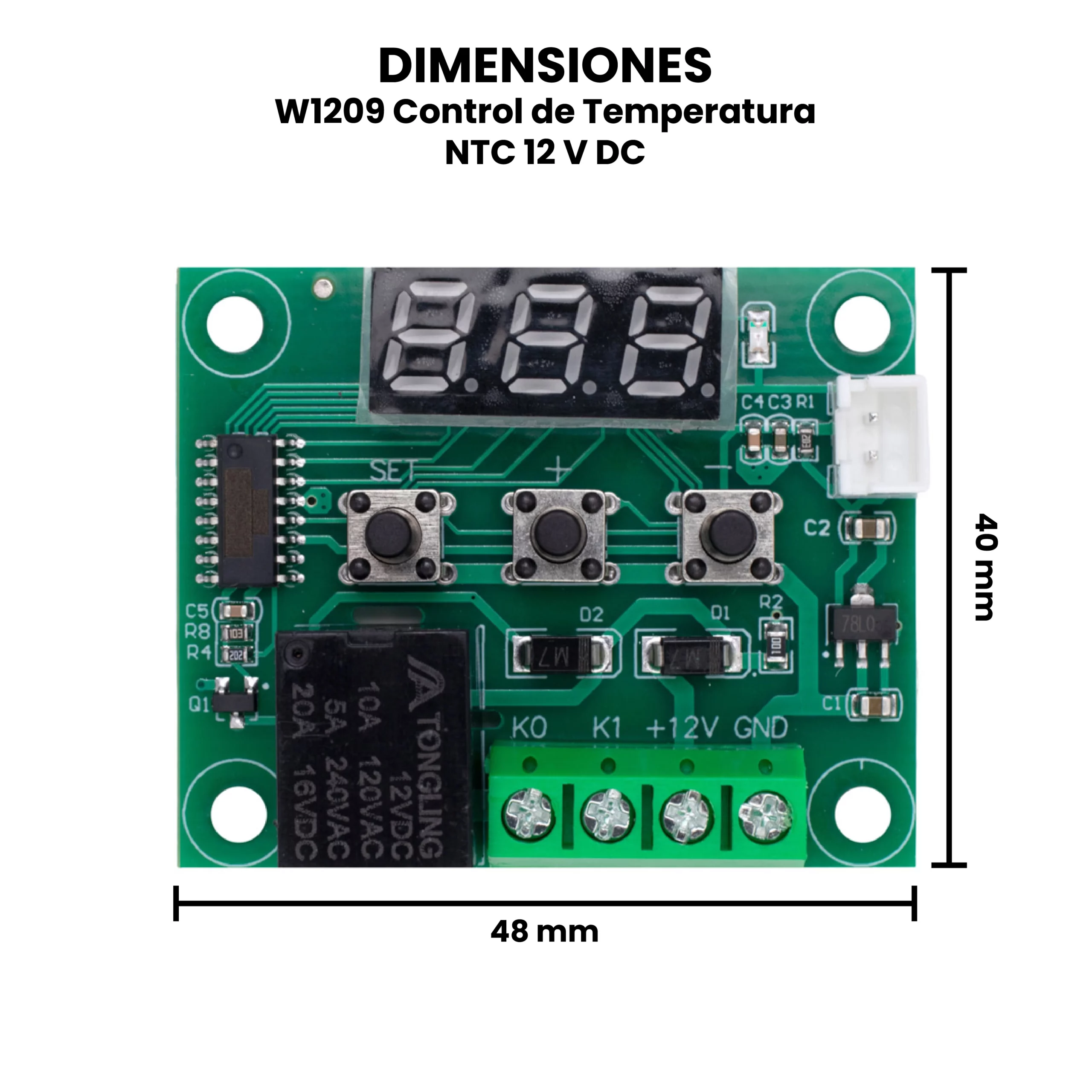 El W1209 Control de Temperatura NTC 12V DC es un módulo electrónico compacto que permite monitorear y controlar la temperatura de manera precisa utilizando un sensor NTC (coeficiente de temperatura negativo). Funciona con una alimentación de 12V DC y cuenta con una pantalla digital de tres dígitos que muestra la temperatura en tiempo real. Este módulo incorpora un relé que se activa o desactiva automáticamente según los parámetros establecidos por el usuario, lo que lo hace ideal para sistemas de control térmico como incubadoras, sistemas de refrigeración, acuarios, invernaderos y proyectos de automatización. El W1209 Control de Temperatura 12 V DC incluye un sensor de temperatura impermeable NTC (10 K 0.5%).