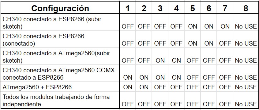 La WeMos Mega WiFi R3 ATmega2560 + ESP8266 32MB dispone de un interruptor para cambiar entre los modos de programación y uso de los dos microcontroladores cuyo comportamiento se describe como se muestra en el siguiente tabla.