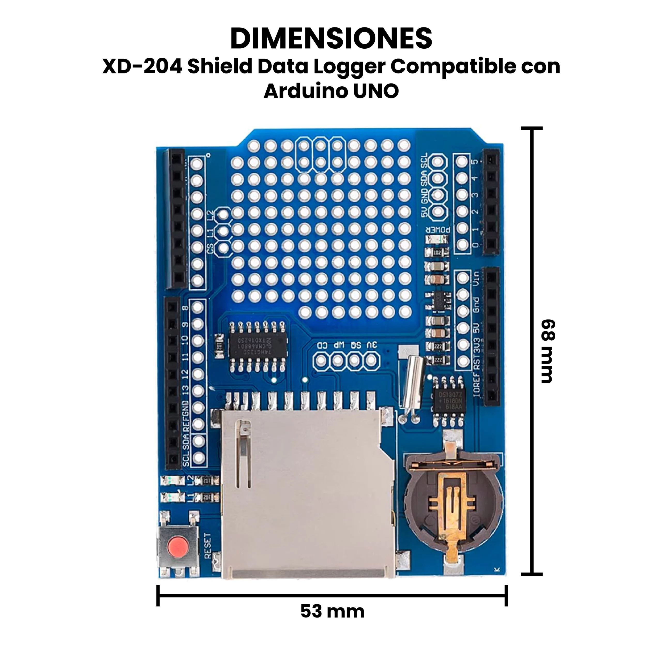 El XD-204 Shield Data Logger se utiliza principalmente para proyectos donde es necesario almacenar información de manera continua, como medición ambiental, monitoreo de sensores industriales, registro de voltajes, sistemas de seguridad, estaciones meteorológicas, seguimiento de variables en proyectos escolares y cualquier aplicación que requiera guardar datos sin depender de una computadora. Gracias a su diseño tipo shield, es totalmente compatible con Arduino UNO, y también puede usarse con otras tarjetas basadas en el mismo formato de pines como Arduino Mega 2560, Arduino Leonardo.
