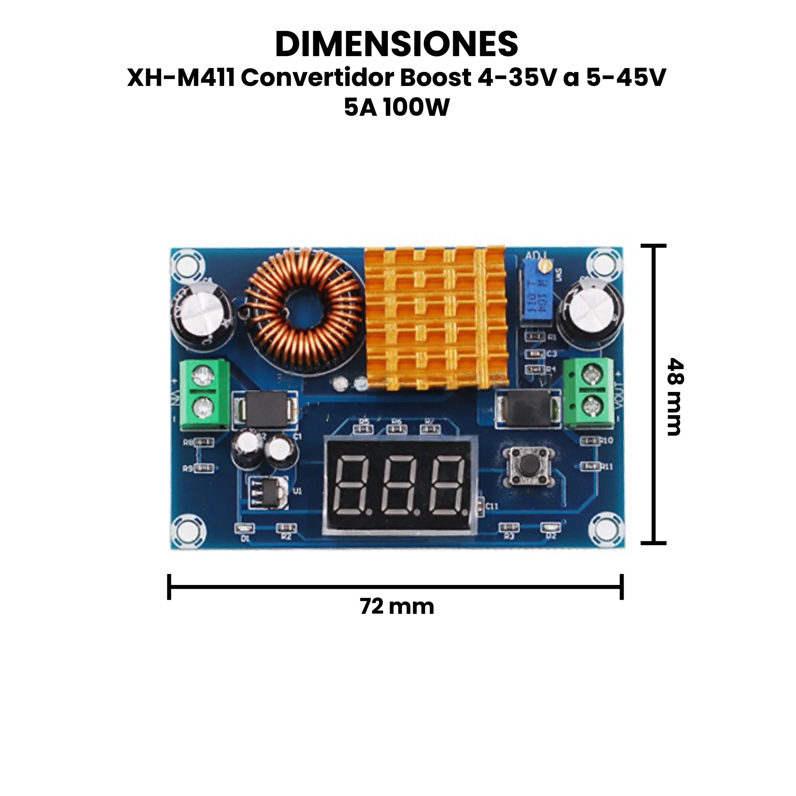 El XH-M411 Convertidor Boost 4-35V a 5-45V 5A 100W es un módulo elevador de voltaje de corriente continua que permite aumentar una tensión de entrada baja (desde 4V hasta 35V) a una tensión de salida más alta ajustable entre 5V y 45V, con capacidad de manejar hasta 5 A y una potencia máxima de 100W. El módulo incorpora un potenciómetro para ajustar la salida y una pantalla digital para monitorear el voltaje.