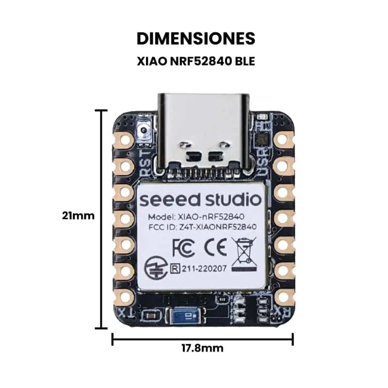 La XIAO BLE nRF52840 es una mini tarjeta de desarrollo compacta y poderosa, basada en el microcontrolador nRF52840 de Nordic Semiconductor. Se destaca por su conectividad Bluetooth Low Energy (BLE), para aplicaciones de comunicación inalámbrica de bajo consumo. Además, cuenta con una variedad de interfaces como I2C, SPI, UART, y ADC, que permiten la integración con múltiples sensores y dispositivos externos.