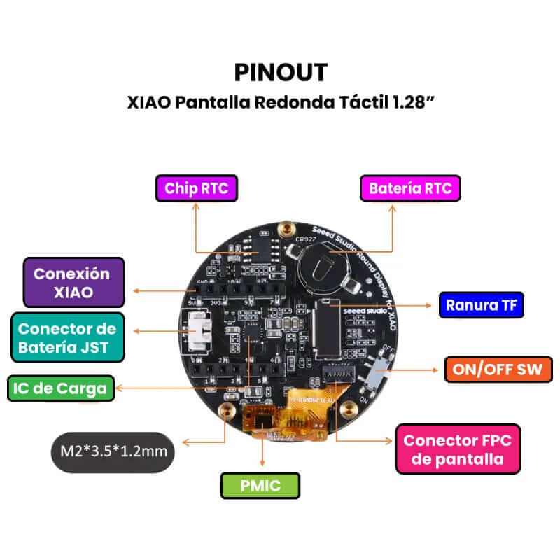La XIAO Pantalla Redonda Táctil 1.28 es compatible con todas las placas de desarrollo XIAO y tiene un bajo consumo de energía. La pantalla cuenta con ranura de expansión parta tarjeta TF, es de tamaño compacto y es compatible con Arduino.