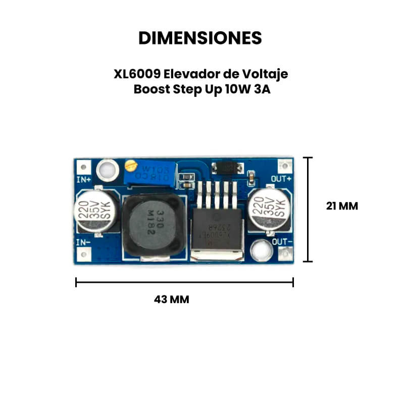 El XL6009 Elevador de Voltaje Boost Step Up 10W 3A es un regulador de voltaje de tipo conmutado de incremento (Step-Up o Boost) y puede obtener voltajes entre 5V – 35V y es capaz de manejar una carga de hasta 3A o 10 W máximo; a partir de una fuente con un voltaje inferior.