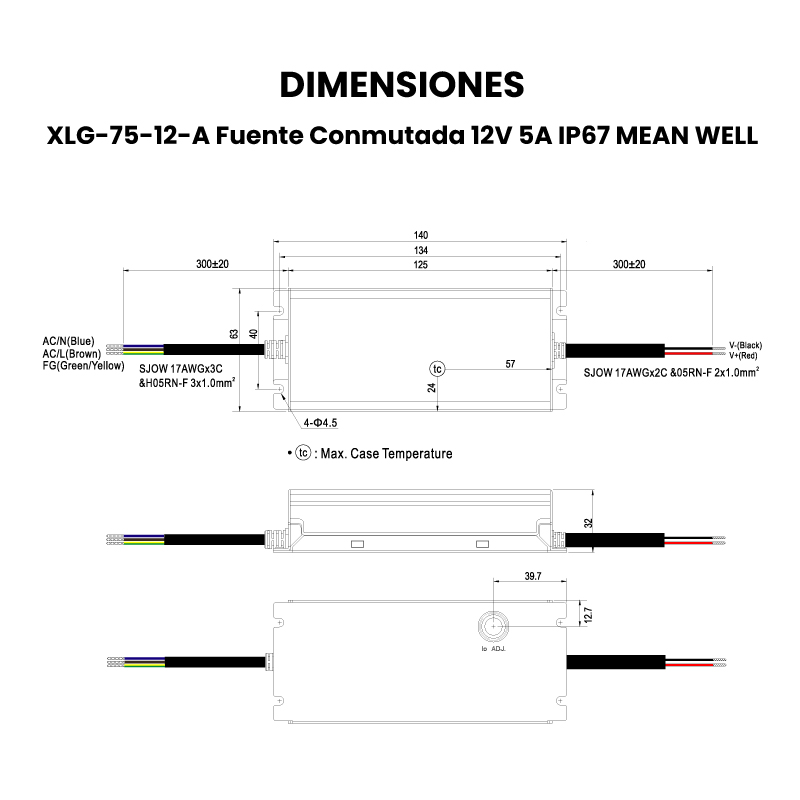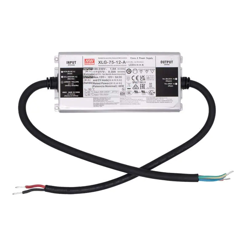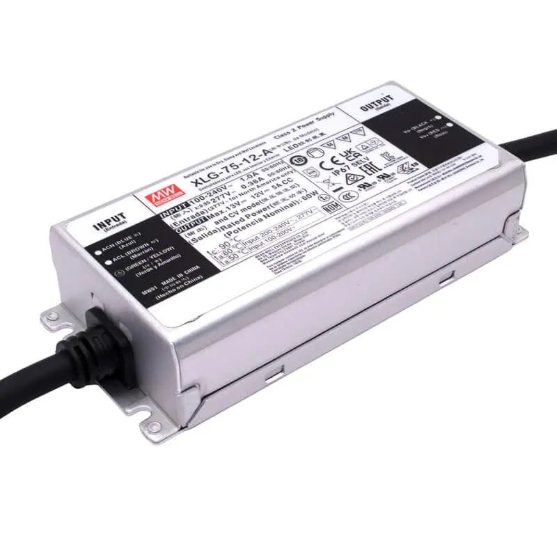 La XLG-75-12-A de MEAN WELL es una fuente conmutada tipo driver LED de 60W, diseñada para entregar 12V DC a 5A, ideal para aplicaciones de iluminación profesional. Opera con un amplio rango de entrada de 100 a 305V AC, lo que permite su uso en instalaciones industriales, comerciales y residenciales sin necesidad de seleccionar voltaje manualmente.