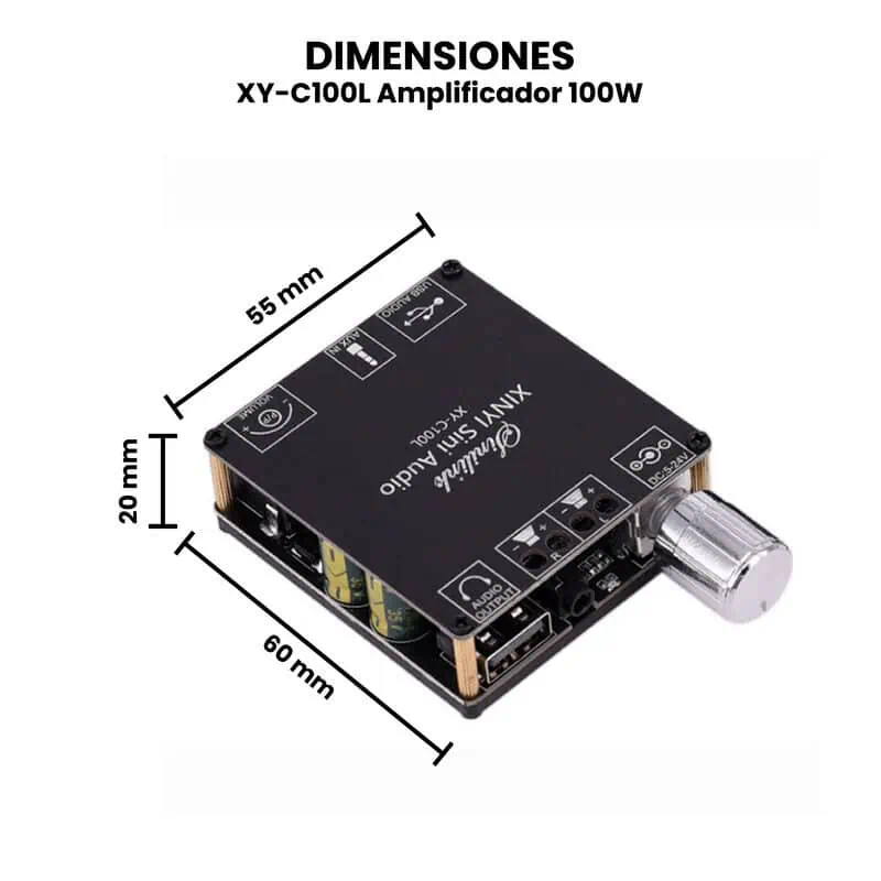 El XY-C100L Amplificador 100W es un módulo de audio de alta potencia diseñado para amplificar señales de sonido con excelente calidad y baja distorsión. Funciona mediante un circuito integrado de clase D, el cual convierte la señal de audio en una modulación por ancho de pulso (PWM) que posteriormente se filtra para obtener una salida analógica amplificada. Este tipo de amplificación ofrece alta eficiencia energética, generando poco calor incluso a altas potencias. El módulo XY-C100L puede funcionar con una alimentación de 5 V a 26 V DC y entregar hasta 100 W por canal, siendo ideal para altavoces de rango medio y alto.