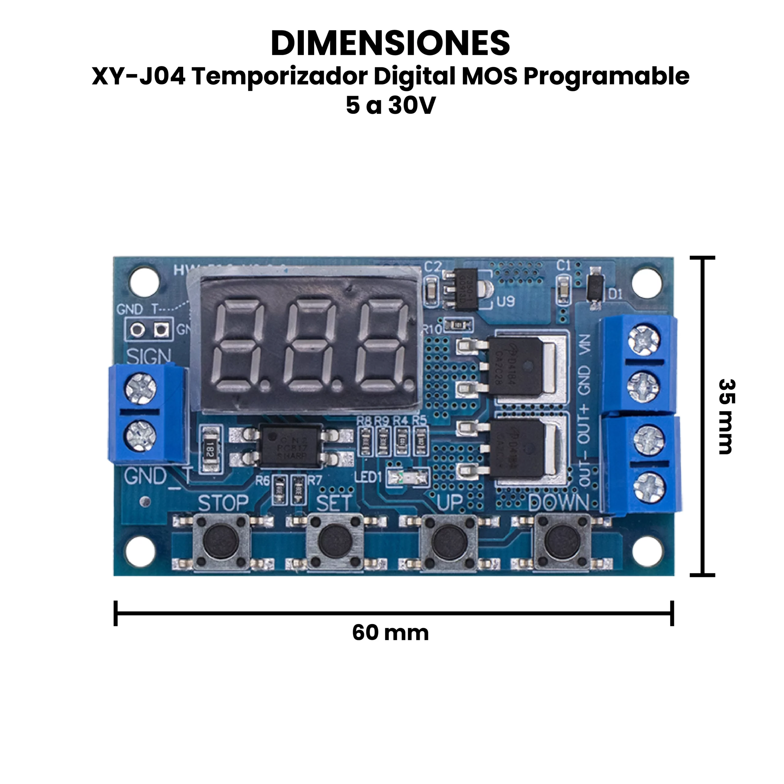 El XY-J04 Temporizador Digital MOS Programable 5 a 30V es un módulo electrónico diseñado para controlar el encendido y apagado de cargas de corriente directa mediante temporización ajustable. Tiene un rango de alimentación de 5 a 30V DC y utiliza un MOSFET como elemento de conmutación. A través de su display y botones integrados, el usuario puede programar distintos modos de trabajo, como retardo al encender, retardo al apagar, ciclos repetitivos ON/OFF y temporización por intervalo.