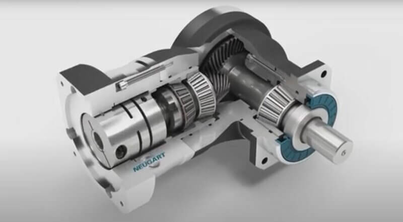 Este tipo de motorreductor se caracteriza por el hecho de que el eje de entrada y el eje de salida son ortogonales, es decir, forman un ángulo de 90°.