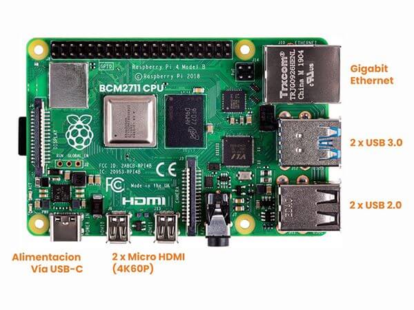 | Procesador: Broadcom BCM2711B0 de 64 bits con 4 núcleos ARM Cortex-A72 Frecuencia de Reloj: 1.5 GHz GPU: VideoCore VI 500 MHz Conectividad inalámbrica: 4GHz / 5GHz IEEE 802.11 b/g/n/ac Bluetooth: 5.0 BLE Conectividad de red: Gigabit Ethernet Alimentación: 5V a 3V Compatibilidad: Debian GNU / Linux, Windows, Fedora, Arch Linux, RISC OS, etc. Almacenamiento: microSD Temperatura de operación: 0°C a 50°C, recomendable usar disipador y/o ventilador. Dimensiones: 88 x 58.8 x 19 mm Peso: 50g | GPIO 40 pines 2 micro HDMI 2 USB 2.0 2 USB 3.0 (rapidez en la transferencia de datos) CSI (cámara Raspberry Pi) DSI (pantalla táctil) Jack de 3.5 mm Micro SD USB-C (alimentación) Power-over-Ethernet (PoE) |
