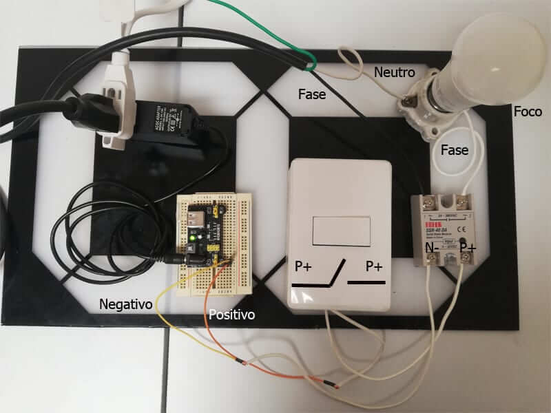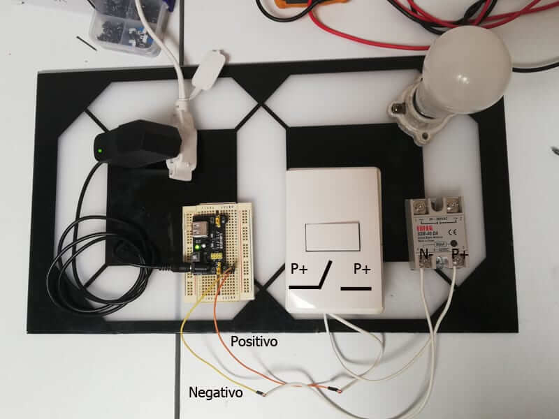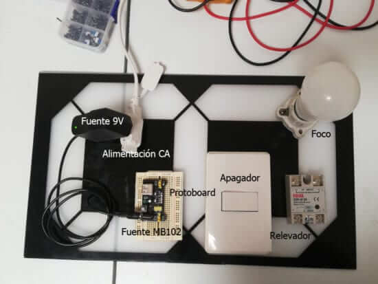Lo que debes hacer es intercambiar el apagador sencillo “manual” por el circuito eléctrico que acabas de realizar. Los 5 volts que salen de la fuente Protoboard MB-102 conéctalo a la entrada de nuestro circuito eléctrico y posteriormente la salida del mismo a la entrada del relevador SSR-40 DA.