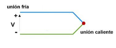Está compuesto por dos metales distintos que producen un voltaje en función de la diferencia de temperaturas entre uno de los extremos comúnmente llamado unión caliente y el otro denominado unión fría o de referencia (Fig 13).