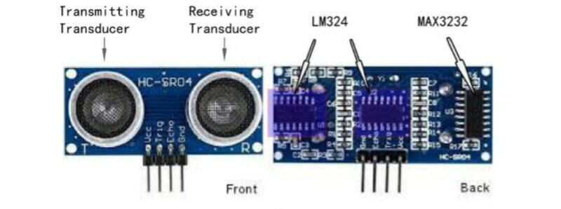 El sensor ultrasónico consta de dos 2 transductores (cilindros de metal), de forma analógica al anterior ejemplo, se emiten pulsos de sonido ultrasónico de 40 KHz por uno de sus dos transductores, al momento que el sonido rebote de algún objeto presente, el eco es captado por el segundo transductor. Al momento de recibirlos produce un pulso de salida cuyo ancho se puede utilizar para determinar la distancia recorrida por el pulso emitido.