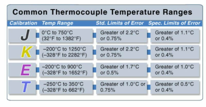 En el mercado existen diferentes tipos de termopares: J, K, E y T, en la siguiente tabla se muestran los rangos de temperatura y la precisión: